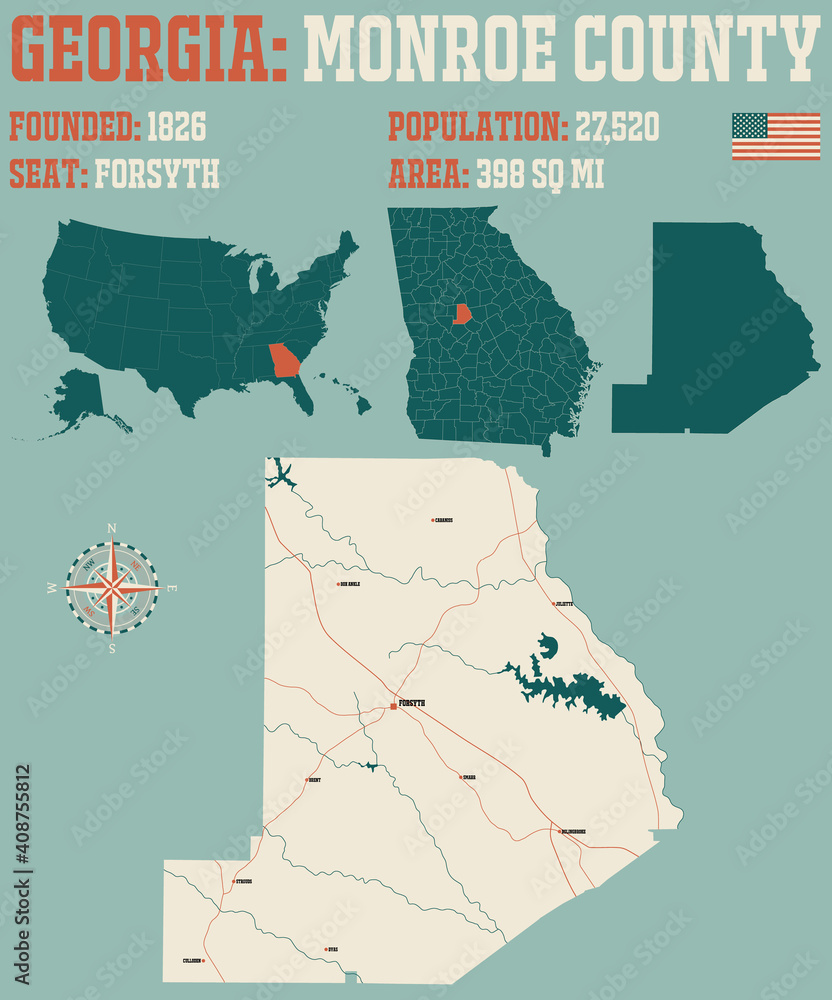 Large and detailed map of Monroe county in Georgia, USA. Stock